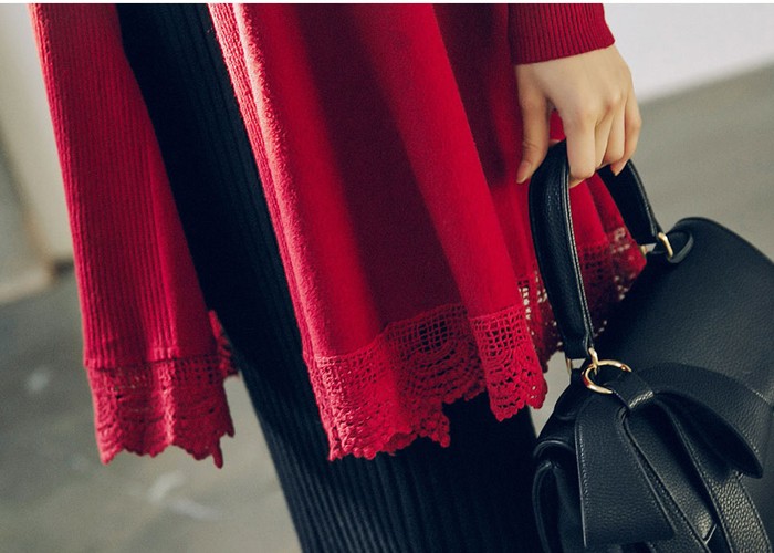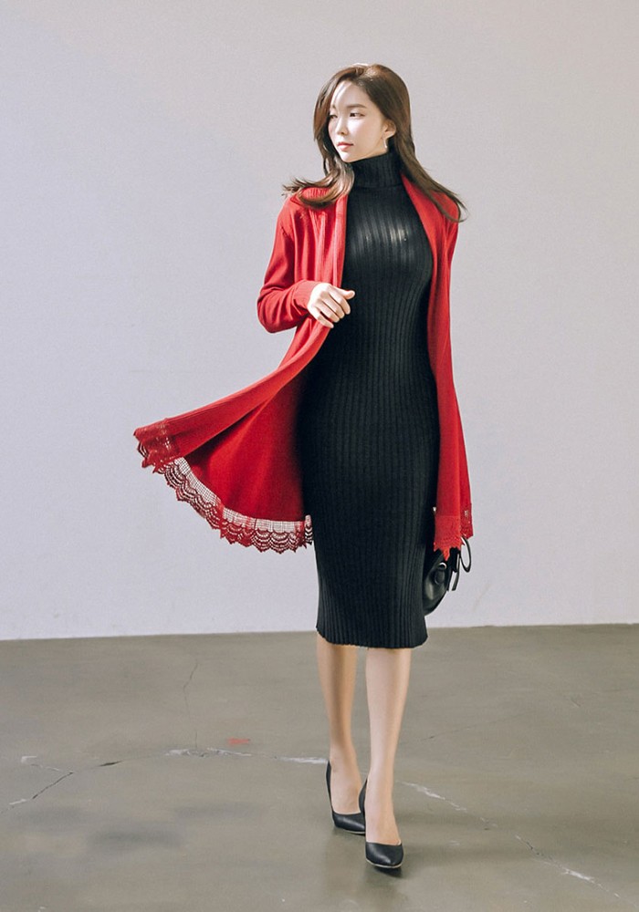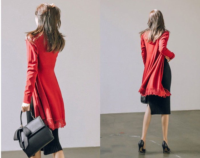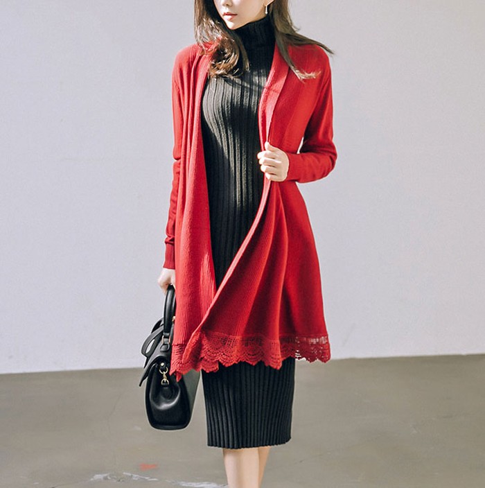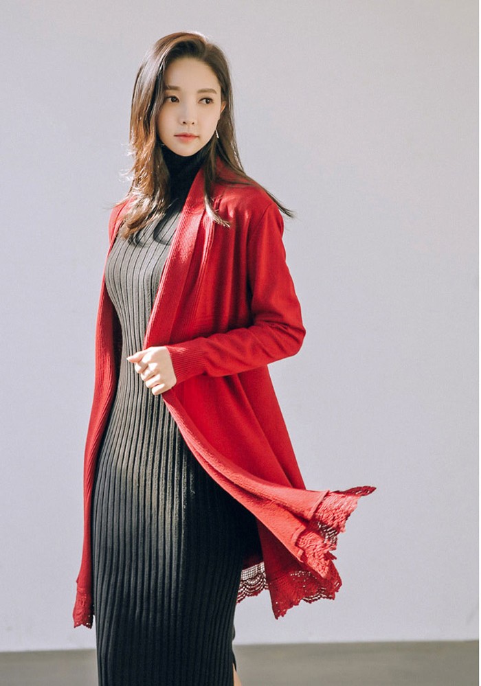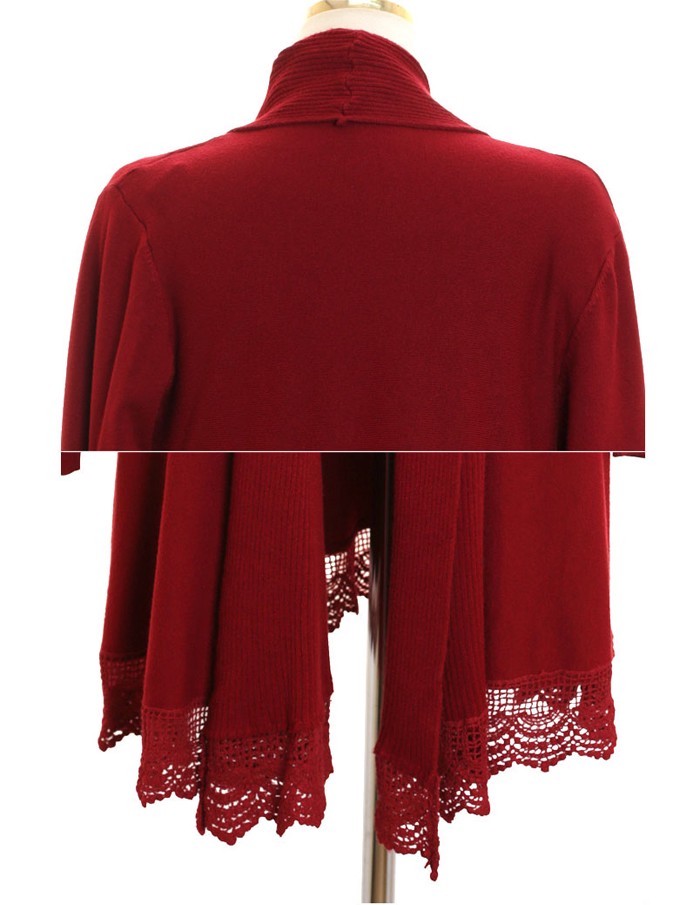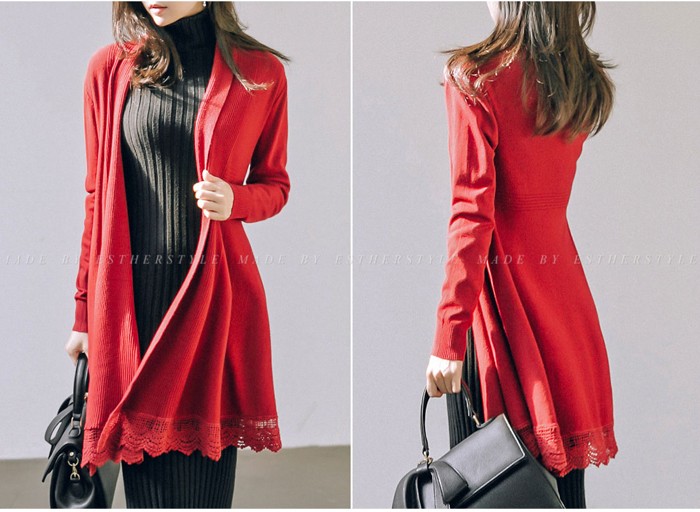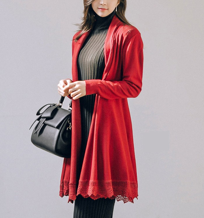 商品名:カーディガン ニット レース配色 カシミヤ混 ロング丈
