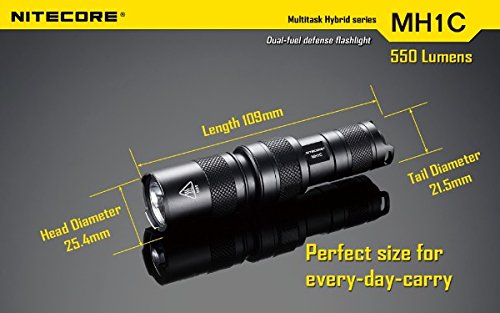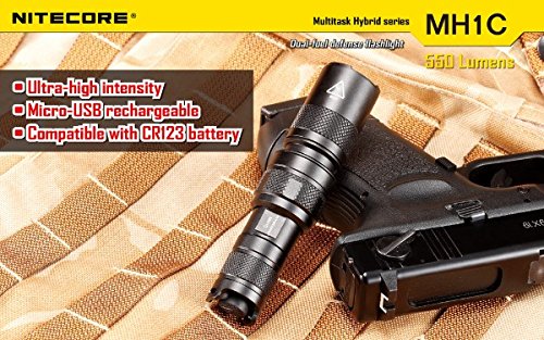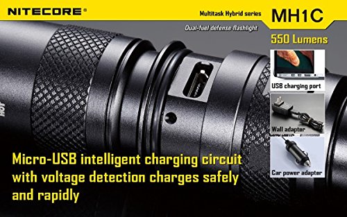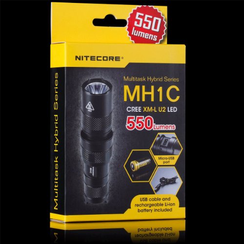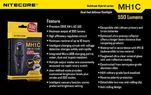 Studio : Light Junction Publisher : Light Junction Binding : Sports Product Description NiteCore MH1C 550 Lumen CREE XM-L U2 LED Flashlight Features Premium CREE XM-L U2 LED Maximum output of 550 lumens High efficiency regulation circuit Maximum runtime of up to 10 hours Intelligent charging circuit with voltage detection charges safely and rapidly Integrated micro USB charging port is water, dust and impact resistant. Multiple output modes are conveniently accessed via rapid rotary switch User-defined mode provides customized brightness levels plus strobe and SOS modes. Intelligent memory function stores preferred brightness setting Broad voltage circuit accepts both rechargeable and non-rechargeable Lithium batteries Optimized ultra-precise reflector offers a longer beam distance than competing products Waterproof in accordance with IPX-8 (submersible to two meters) Toughened ultra-clear mineral glass with anti-reflective coating Constructed from aerospace-grade aluminum alloy HAIII military grade hard-anodized Reverse polarity protection Stainless steel titanium-plated clip Anti-rolling design Battery Power: 1x CR123A Primary battery; 1x RCR123A Li-Ion. 0