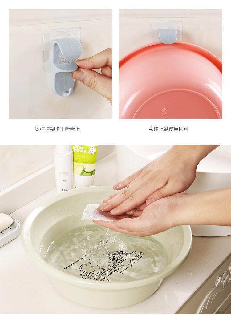 采用ABS材质制作,附送无痕贴,粘贴牢固,可水洗反复使用,轻松收纳多个脸盆,节省居家空间!