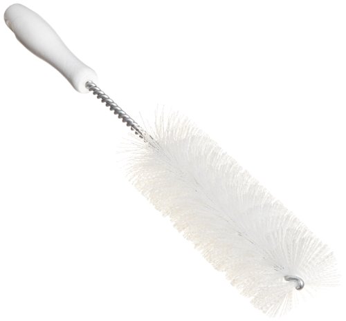 The Carlisle 4018302 Sparta valve and fitting straight brush with white bristles inserts into straight pipes, elbows, tees, valves, and fittings for cleaning. The base is made of galvanized wire with a plastic handle for durability; the bristles are made of stiff polyester that offers abrasion and chemical resistance, shape recovery, and extended life. The base resins used for the bristles are U.S. Food and Drug Administration (FDA) approved. The overall dimensions are 15 x 2-1/2 inches (length x diameter).