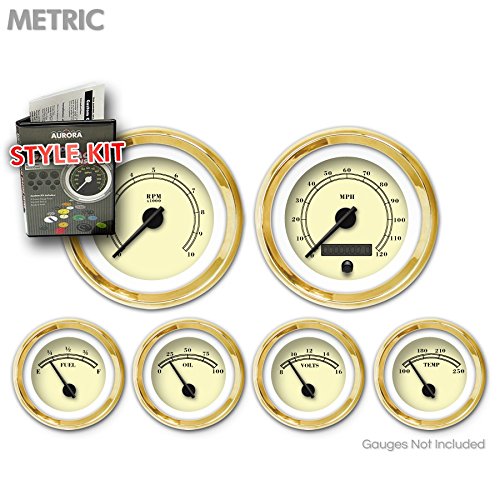 Studio : Aurora Instruments Publisher : Aurora Instruments Binding : Automotive Product Description Style Kit - Metric American Classic Tan, Black Classic Needles, Gold Trim Rings Aurora Style Kits lets you transform the look of your Aurora Gauges with ease. Each gauge style kit includes gauge faces, needles, and trim rings for oil pressure, fuel level, tachometer, speedometer, volt, clock, oil temperature, and turbo boost. Simple, detailed instructions make changing out your Aurora gauge faces, needles, and trim rings a snap - even when the gauges are installed. Choose from thousands of gauge face styles or create you own online. Available in Imperial (SAE) and Metric. Aurora gauges offers the worlds largest selection of gauges and instrumentation for your ride, and are the world's only gauges offering interchangeable gauge faces, trim rings, and needles. Choose from thousands of designs and options, or custom create your own . 0