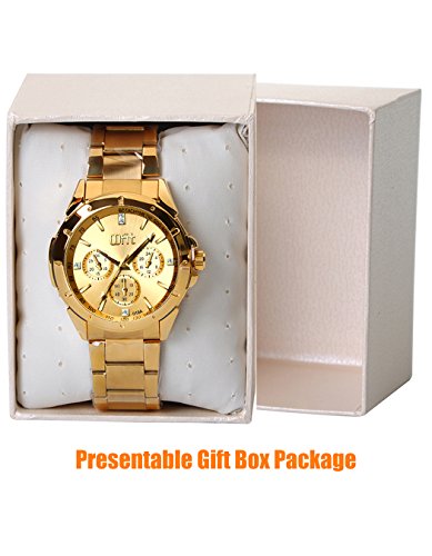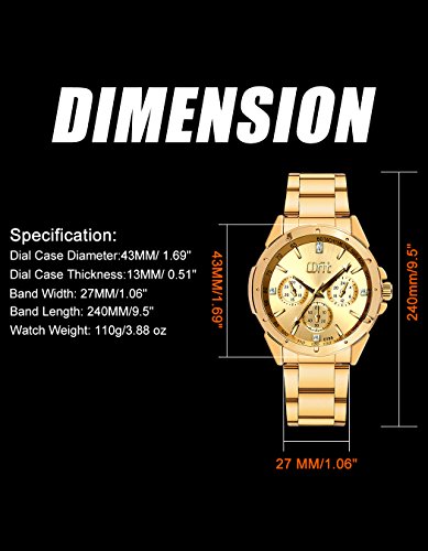 -. Feature : Gold plated stainless steel bracelet / Adjustable wrist band length / Original nice gift box package / Case Diameter: 43mm; Water Resistant To 30m / Best birthday wedding anniversary gifts for him