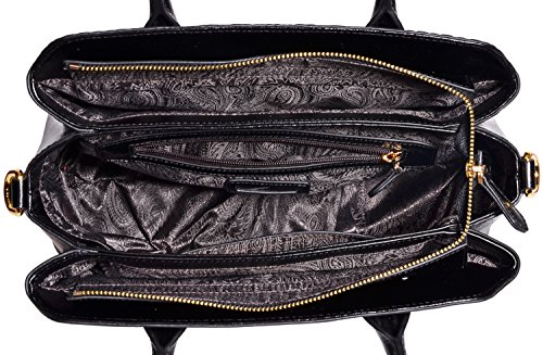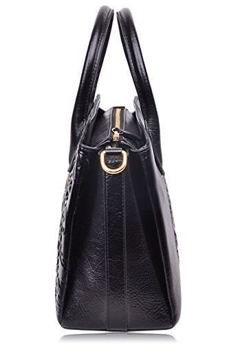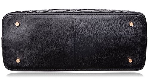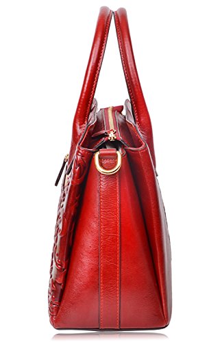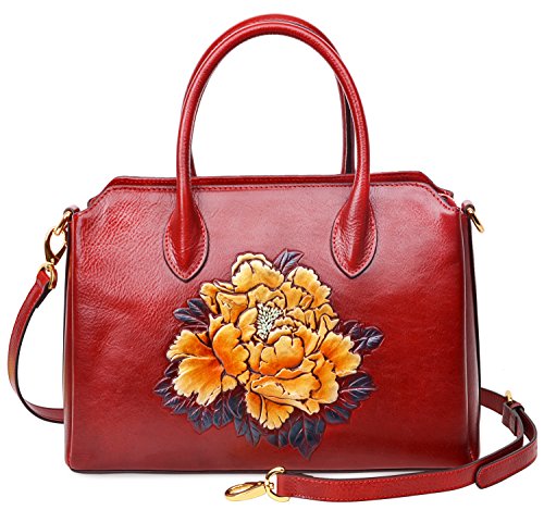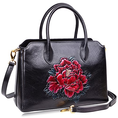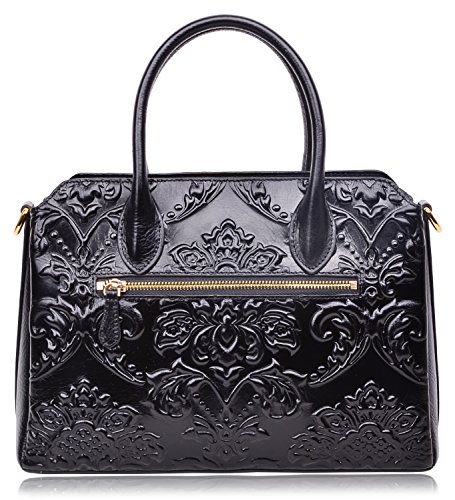 -. Feature : Fashion Leather Handbag : 100% Genuine Leather with Embossed Floral , Fabric Lining; / Dimensions: L13.2" x H9.25"x W 5.3", weight 1.15 kg(2.53 lbs); with 45" removable strap; / Large space for storage : zipper open, 3 big compartments, a zipper pocket in the main compartment, a back zipper pocket; Can fit up to 9.7" Ipad. / FEATURES: Gold-tone Hardware, Detachable Shoulder Strap and Top-zipper Closure; / About Our Customer Service: We strive to provide great customer service and want to make sure you are completely satisfied. If there are any issues, please contact us. Our customer support team is ready to help!