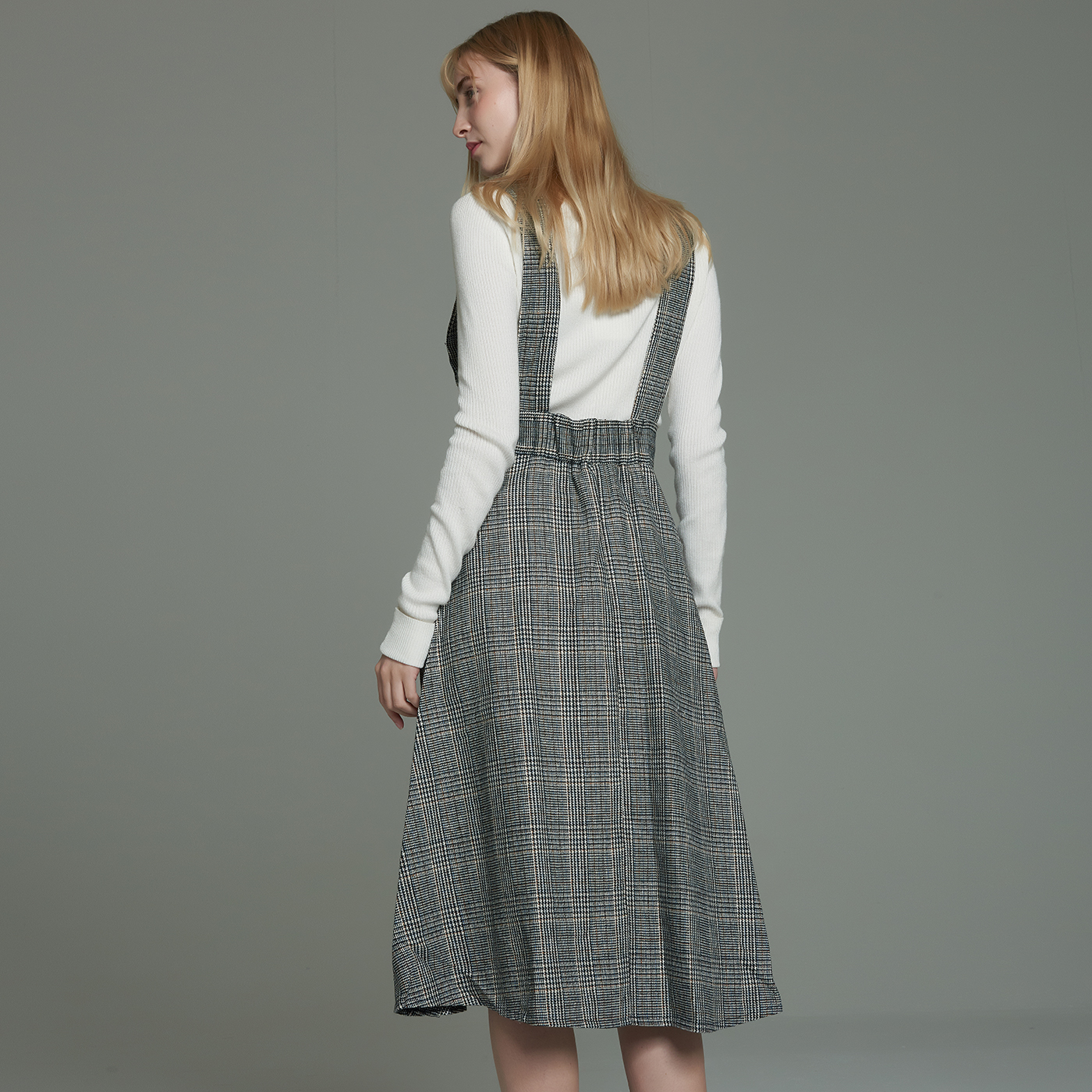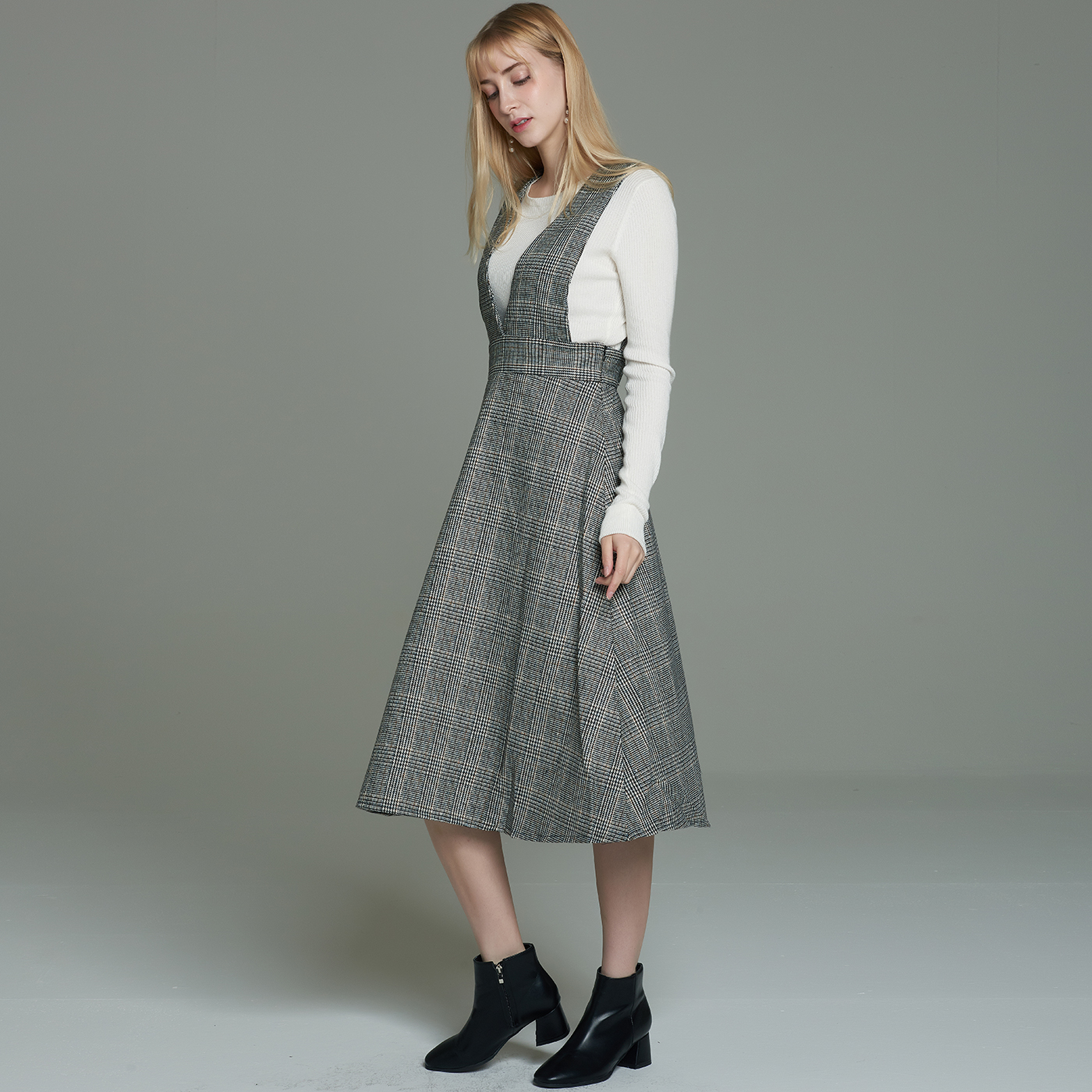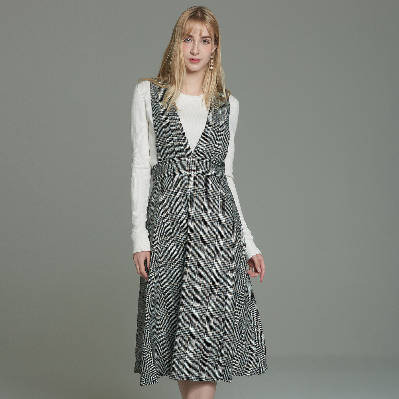 멜빵스타일의 체크원피스입니다.