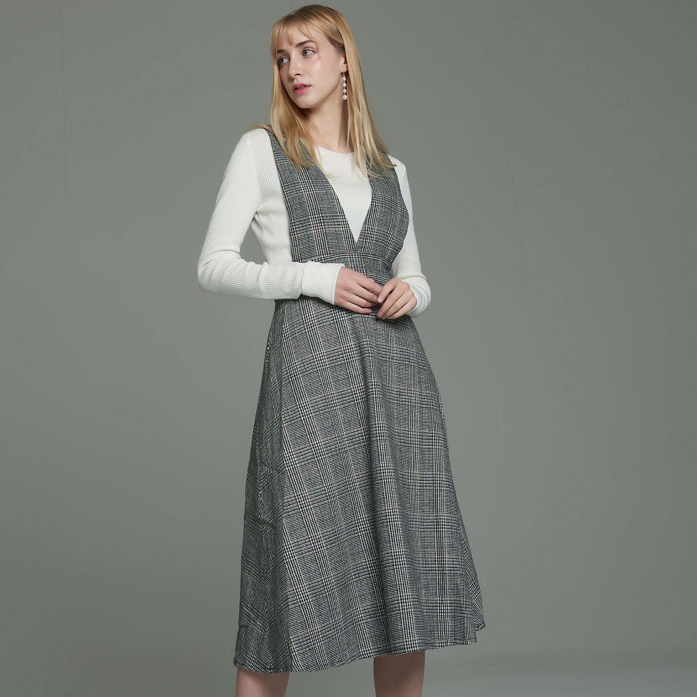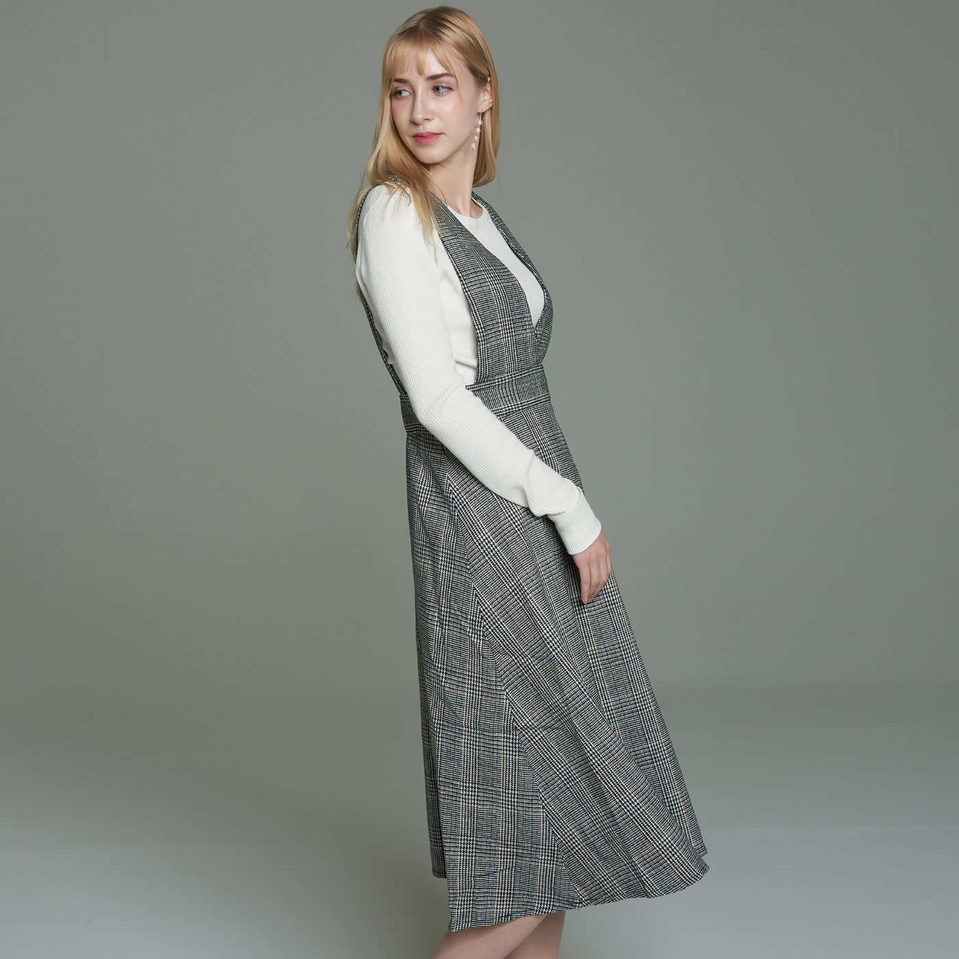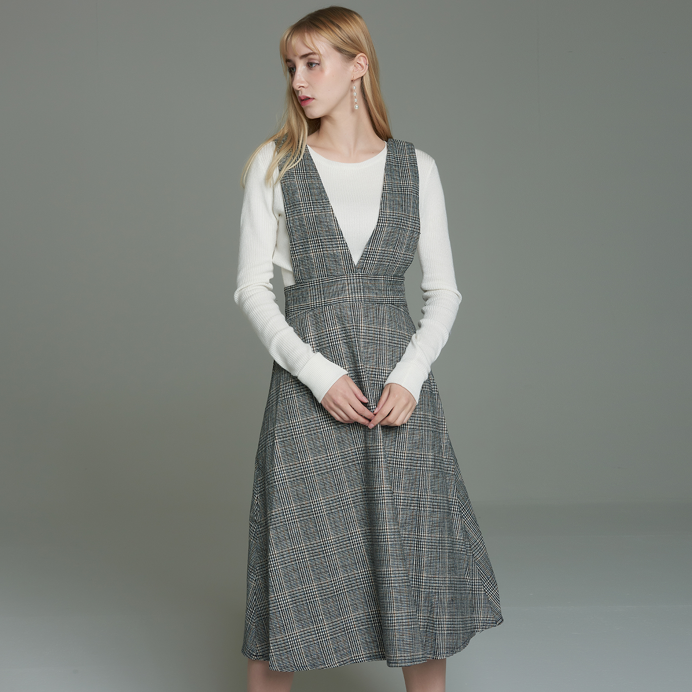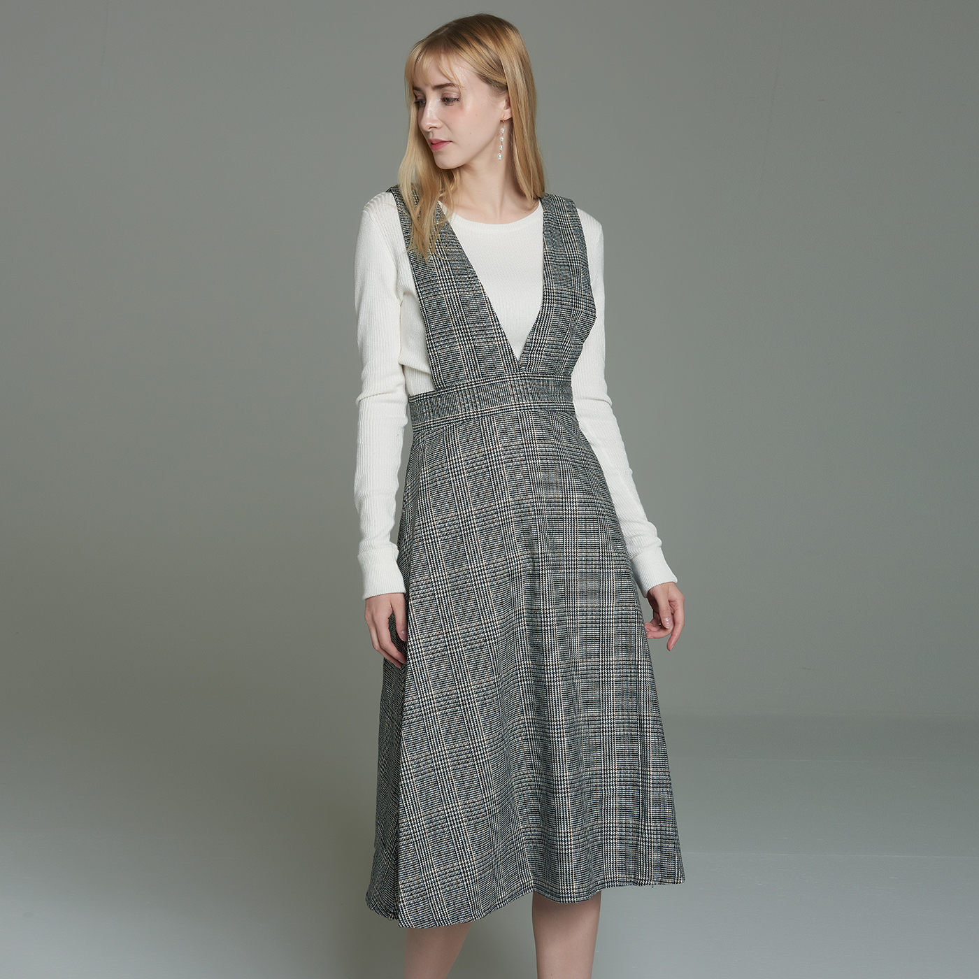 멜빵스타일의 체크원피스입니다.