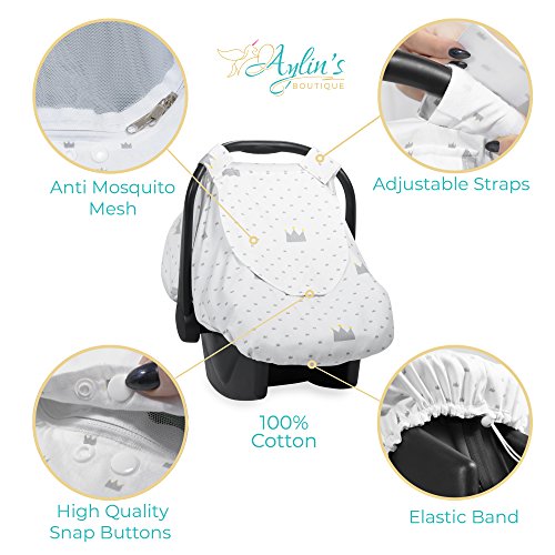 ? KEEP YOUR BABY SAFE AND PROTECTED: The peek-a-boo opening allows you to interact with your baby while awake or check on your newborn or infant without disturbing a nap. Aylin's Boutique car seat canopy provides optimal coverage while still allowing air flow. It also shields your little one from dust, wind, bright sunlight, germs, allergens, light rain, insects and peepers. It features detachable bug and sand mesh cover.