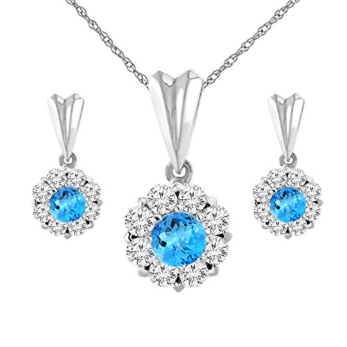 -. Binding : Jewelry -. Brand : Sabrina Silver -. Department : womens -. Feature : 14K Solid Gold / Naturally-vibrant, superior quality color gemstone / High Quality Genuine Diamond Accents / Complimentary gold chain included -. ProductGroup : Jewelry -. ProductTypeName : FASHIONOTHER -. Title : 14K White Gold Natural Swiss Blue Topaz Earrings and Pendant Set with Diamond Halo Round 4 mm