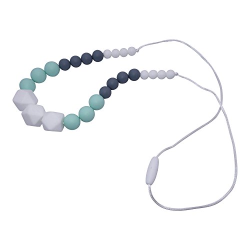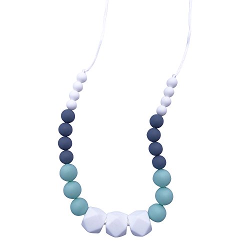 The Soother Chewer Designer Teething Necklace by Bumble Bee transforms effective, chewy teething tools into a stylish necklace that moms truly love to wear! Designed for both moms and babies, this chewing necklace will bring you and your little one closer as a toy that soothes your baby throughout the entire teething process. 25 smooth and textured chew beads link together to form a stylish, beaded statement necklace and the modern color scheme of crisp white, navy blue, and teal goes with almost every outfit! Our fashionable outcomes are rooted in functional goals. Different colors, sizes and textures of beads inspire your baby's curiosity and stimulate sensory development! This teething necklace also features four levels of chewiness that range from squishy and soft to firm, hard chew beads. It's so important that your baby has a variety of surfaces to massage and soothe tender gums while they grow and develop. Most importantly, the Soother-Chewer is designed with the highest emphasis on safety for your baby. 100% silicone is FDA-approved to be non toxic, hypoallergenic,BPA-free, phthalate-free, lead-free, and metal-free. There are absolutely no plastic or fillers! Pure silicone is soft, flexible, lightweight, and will always keep its shape. Wear the stylish, soft necklace for intimate time with your baby. Enjoy special time with your little one and deliver soothing comfort and simple entertainment from around your neck and in your arms with Bumble Bee.Feature
