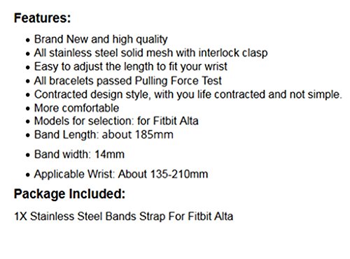 -. Feature : Designed for Fitbit Alta, and perfect replace your original band / Fitbit alta band is crafted from stainless steel, fits your device well. / Material:Premium stainless steel, Smooth edge bracelet watch band strap.More soft and comfortable and easy to adjust the length to fit your wrist. / Size:Fits for 5.3 inch - 8.3 inch wrist.Adjustable Brushed Stainless Steel Deployment Clasp design which locks onto your Watch band interface precisely and securely and convenient to put on or take off it with the tool / One year warranty, unconditionally refund or resend with any quality problems, life-time friendly customer service.