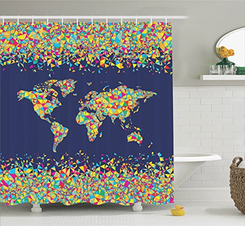 Map Shower Curtain Wanderlust Decor by Ambesonne, World Map Organized by Layers Mosaics Tiles Global Vibrant Colors Festive , Fabric Bathroom Set with Hooks, 69W X 70L Inches