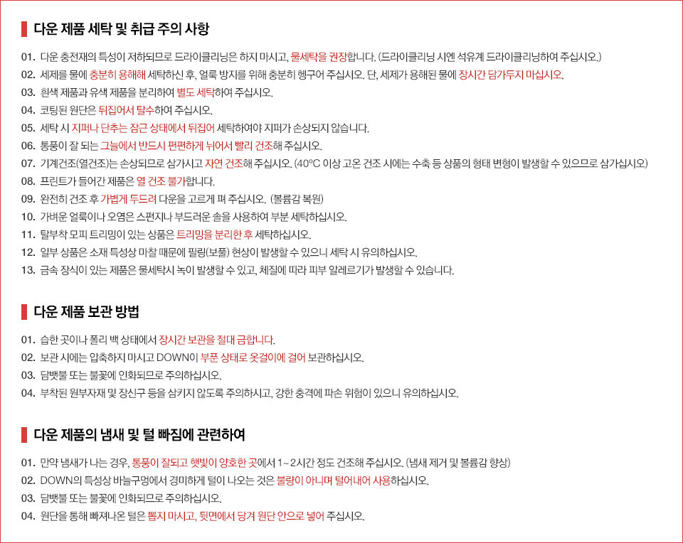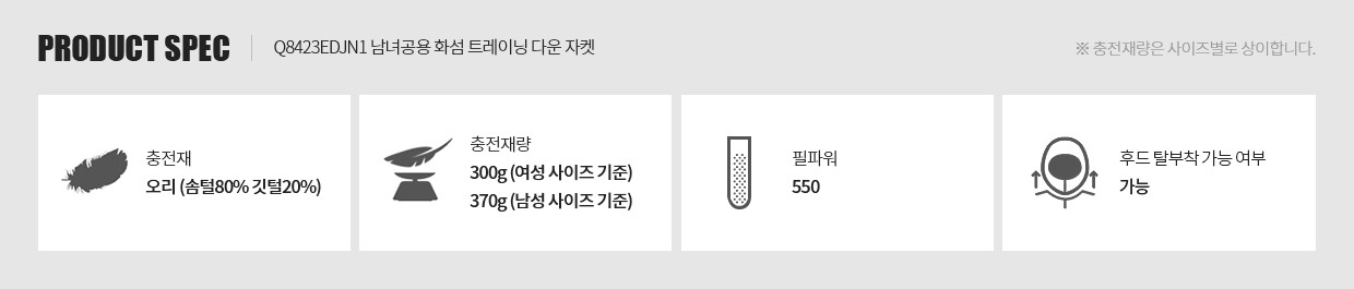 | 소재 | 겉감:나일론84%폴리우레탄16% 안감1:폴리에스터100% 안감2:폴리에스터100% 충전재:오리솜털80%오리깃털20% |