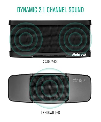 -. Brand : Nekteck -. Color : Black -. EAN : 0634324696504 -. Feature : GREAT SOUND PERFORMANCE: The Nekteck Bluetooth Speaker delivers a powerful sound with 20 watts of power. It is built with amazing 2.1 channel system delivered by 10W drivers, 10W subwoofer and 2 passive bass radiator for a true home theatre sound in a compact, easy to use package. / LATEST BLUETOOTH VERSION: This speaker is compatible with Bluetooth 4.1 and supports A2DP, HSP, HFP, AVRCP profiles agreement. It has a great connection range up to 10m or 33ft in distance. It also supports AUX external audio input so you can play music via wired connection. / 6th GENERATION CVC TECHNOLOGY: The latest 6th generation CVC technology comes with high efficiency noise reduction and echo cancellation feature. It offers high quality sound experience. / INDOOR AND OUTDOOR SPEAKER: Be thrilled with the Nekteck Bluetooth Speaker that offers 2 modes of music just right for you. Have a clear, cinematic sound while in a room or pump up the bass and audio output for any outdoor activities. / LONG PLAYTIME: Enjoy 8 hours of playback time with 7.4V, 2000mAh battery built in the speaker, which allow you play up to 160 songs at mid-level volume on a single charge. (Playtime varies by volume level and audio content). -. IsEligibleForTradeIn : 1 -. Label : Nekteck -. Manufacturer : Nekteck -. Model : NK-S1 -. MPN : NK-S1 -. PackageQuantity : 1 -. PartNumber : NK-S1 -. ProductGroup : Speakers -. ProductTypeName : CE_CARRYING_CASE_OR_BAG -. Publisher : Nekteck -. Studio : Nekteck -. Title : Nekteck NK-S1 Bluetooth Speakers 2.1 Channel Wireless Portable Speaker with Mic, Stereo 20W Premium Audio from 10W Drivers, 10W Subwoofer and Dual Passive Radiators, 2 Mode Equalizer - Black -. UPC : 634324696504
