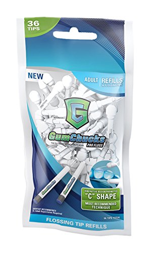 Studio : Oralwise Inc Publisher : Oralwise Inc Binding : Misc. Product Description Adult PRO FLOSS Loose Flossing Tips. 36 Loose Tips per package. Disposable flossing tips include a 22-mm piece of lightly waxed, high quality dental floss. Made with 250 strands of twisted fiber, the floss has a high shred tolerance to keep it gliding smoothly between teeth. And the Gumchucks quick-release button system makes it easy to chuck flossing tips after each use. (If you want tips in the blue trays that fit inside the travel case - please order the cartridges) These are the standard flossing tips and can be used with any Gumchucks handles. 0