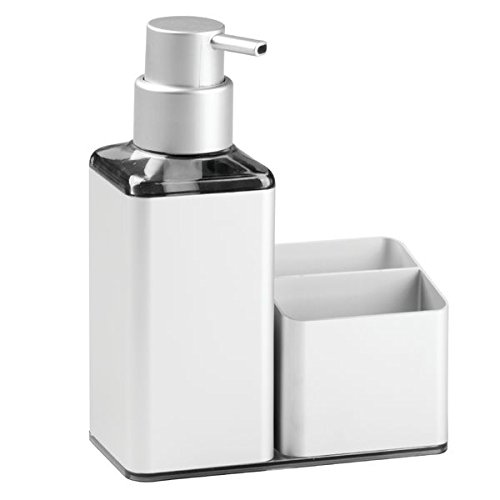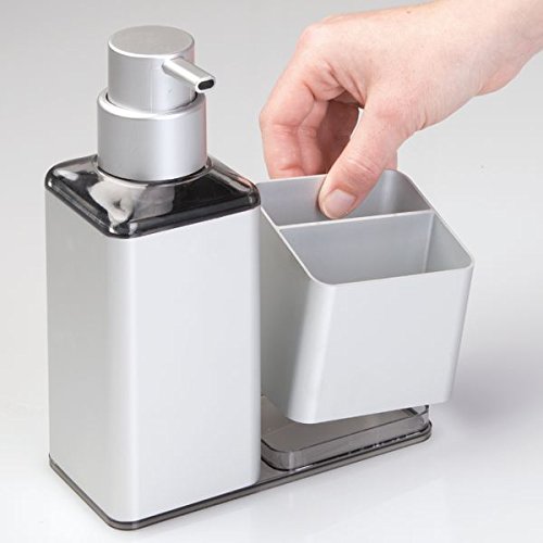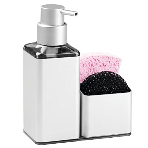 mDesign Rustproof Aluminum Soap Dispenser Pump and Sponge Caddy Organizer for Kitchen Countertops - Square, Silver
