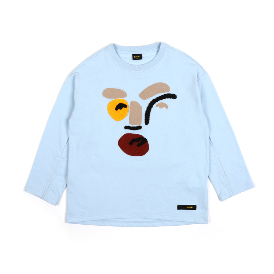 추상적인 얼굴 형상의 유니크한 자수 패치가 인상적입니다.