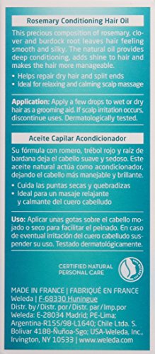 -. Binding : Health and Beauty -. Brand : Weleda -. EAN : 6893750685436 -. Feature : Ideal for daily hair maintenance and/or as deep / Organic burdock root extract revitalizes and nourishes / Organic rosemary leaf oil helps to strengthen dry -. IsAdultProduct : 0 -. IsAutographed : 0 -. IsMemorabilia : 0 -. Label : Weleda -. LegalDisclaimer : Actual product packaging and materials may contain more and different information than what is shown on our website. We recommend that you do not rely solely on the information presented and that you always read labels, warnings, and directions before using or consuming a product. Please see our full disclaimer below. -. Manufacturer : Weleda -. Model : 606061 -. MPN : 9563 -. NumberOfItems : 1 -. PackageQuantity : 1 -. PartNumber : 9563 -. ProductGroup : Beauty -. ProductTypeName : BEAUTY -. PublicationDate : 2014-12-06 -. Publisher : Weleda -. ReleaseDate : 2014-12-03 -. Size : 1.7 -. Studio : Weleda -. Title : Weleda Rosemary Conditioning Hair Oil, 1.7 Fluid Ounce -. UPC : 190283633986