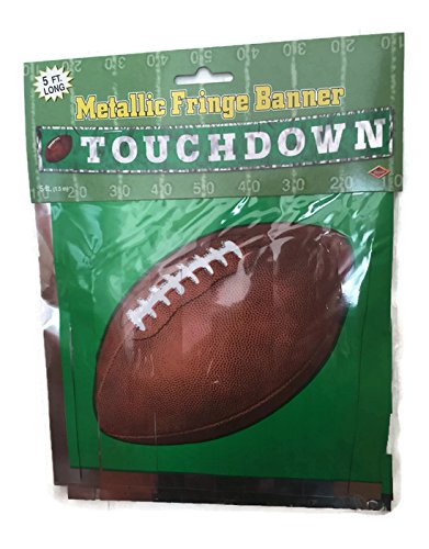 - Feature : Football Shaped 18" inch Keepsake Party Serving Tray & Metallic Fringe "Touchdown" Banner 5 Foot Long / 8- 8 1/2" inch Disposable Paper Plates / 8- 9 oz Disposable Paper Cups / 16 - 2 ply 6 1/2" x 6 1/2" inch Disposable Paper Napkins / Green Plastic Table Cover 54" x 108" inches