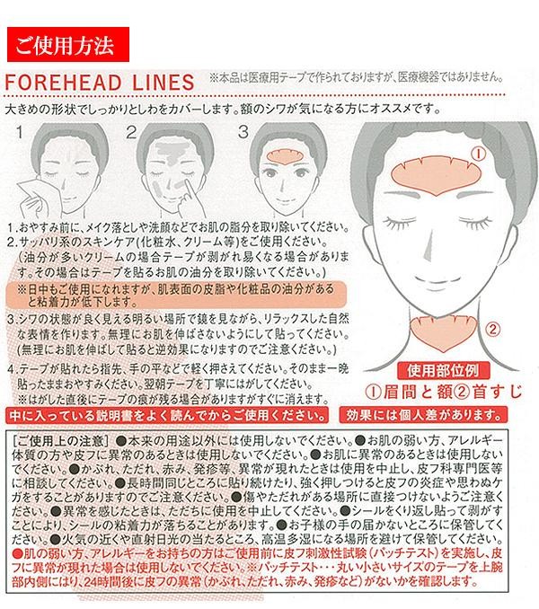 | 普段の表情のクセが少しずつ刻まれてできるのが「表情じわ」。しわ伸ばしテープは、ほどよく堅い医療用テープで皮膚を固定して、寝ている間に、しっかりと気になる「表情じわ」を伸ばしてくれます。寝る前にシワが気になる部分に貼るだけなので、毎日続けられる簡単ケア!!フォアヘッドラインは、大きめの形状でしっかりとシワを包み込みます。額のシワが気になる方にオススメ☆ |