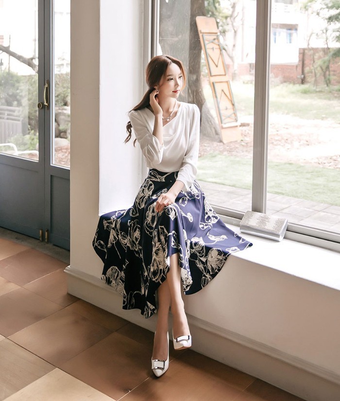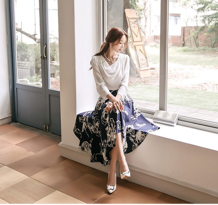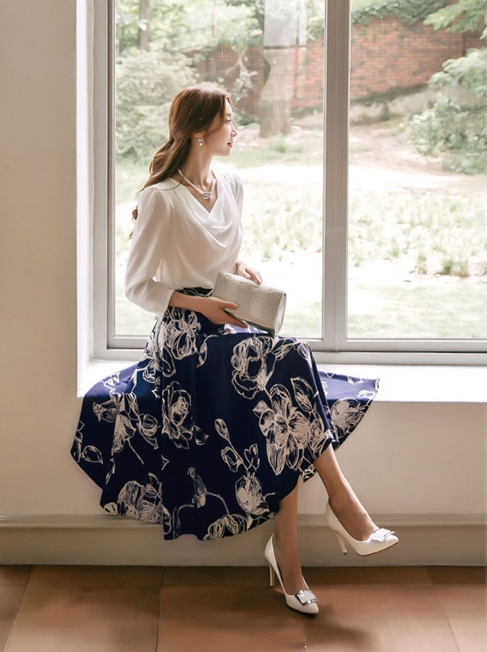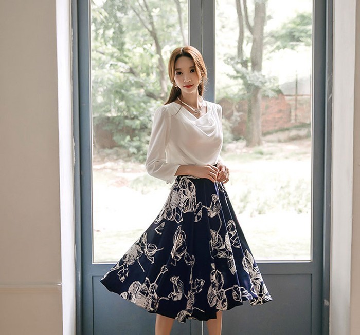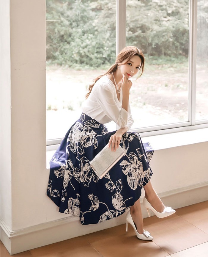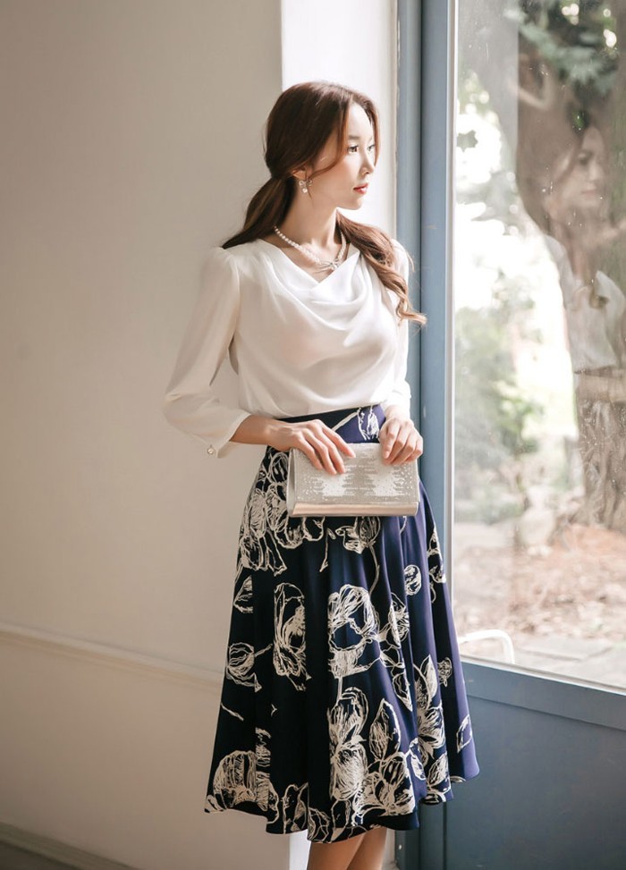 商品名:スカート 膝丈 花柄 フラワー ハイウエスト