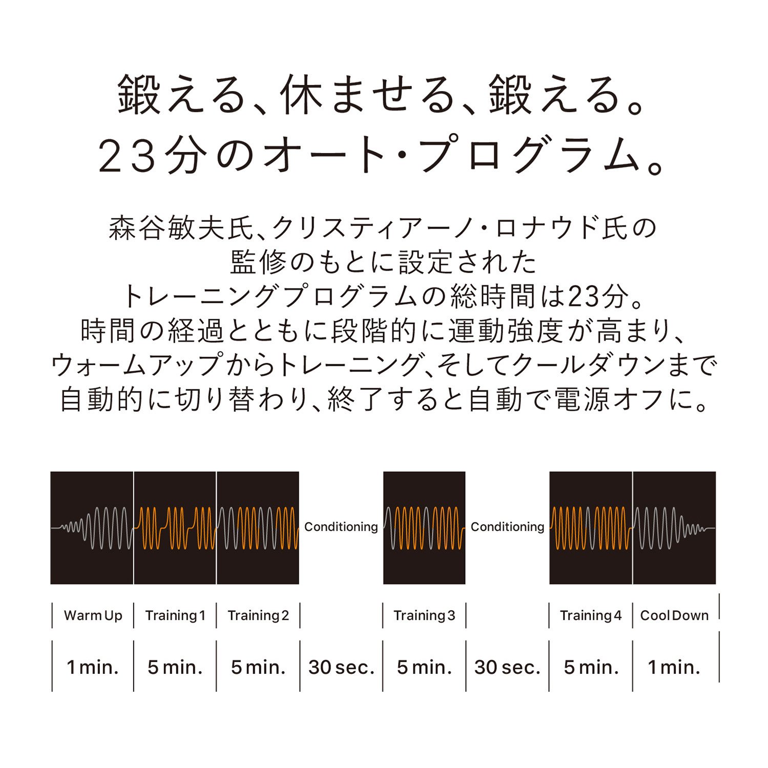 トレーニングに効率的な周波数20Hzを見出した京都大学名誉教授 森谷敏夫氏のEMS理論、独自波形によって低い周波数特有の痛みを解決したMTGの開発力、そして、クリスティアーノ・ロナウド氏のトレーニングメソッド。三者のシナジーから生まれたコアテクノロジー“CMM Pulse”が、SIXPADを唯一無二のEMSトレーニング・ギアにしました。