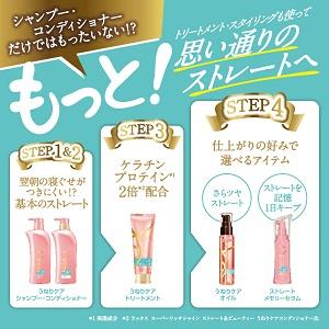 「ラックス 美容液スタイリング ストレートメモリーセラム」は、ストレートメモリーEX*1配合処方がストレートスタイルを記憶。ストレートアイロンの熱による効果でストレートメモリーEX*1を髪表面にしっかり接着することができ、長時間ストレートが続きます。3日に一度のご使用をお勧めします。ヘアアイロンによる熱ダメージを防ぐことも大きな特長。髪のダメージが気になる、髪が湿気を含みうねりやすいなど、これまでストレートヘアをあきらめていた方も簡単にストレートヘアを楽しむことができます。寝る前にトリートメントとして使用し、翌朝そのままアイロンを使ってストレートヘアを作るのもおすすめです。