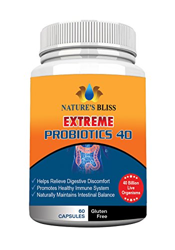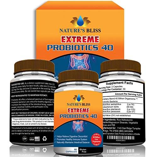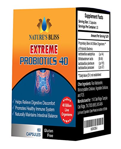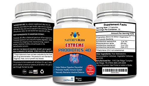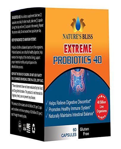 -. Binding : Health and Beauty -. Brand : Nature's Bliss -. EAN : 0617689940321 -. Feature : MAXIMUM POTENCY - With 40 Billion CFU, our patented formula is 8x more powerful than the leading Amazon Best Seller Pro-15. Don't short yourself, get better digestive health support with Nature's Bliss. This supplement is perfect for men, women, and children. / LIVE HEALTHY - Our probiotic replenishes all the good bacteria and adds the best digestive enzymes in your gut for optimal digestive and immune system health. You will experience daily relief from gas, bloating, irregular bowel movements, and this will help balance yeast growth. Constipation relief has never been simpler! / BE HAPPIER & MORE ENERGETIC - Feeling tired and unsettled are often a result of poor nutrient absorption and low vitamins levels. Nature's Bliss Extreme Probiotics helps boost mineral absorption by creating a thriving microenvironment inside your digestive system. You will feel happier, more energetic...your friends and family will notice! / PURE INGREDIENTS - Unlike other competing formulas, our naturally extreme intestinal cleanser formula is Made in the USA by an FDA approved laboratory. You can rest at ease knowing your immune system and digestive health is in good hands! / 1 YEAR GUARANTEE - We stand behind our product. If for any reason you are unsatisfied with your purchase within 365 days, just let us know and we will issue you a no questions asked refund. Try Nature's Bliss Extreme Probiotics now for a better healthier lifestyle! -. IsAdultProduct : 0 -. Label : Nature's Bliss -. Manufacturer : Nature's Bliss -. ProductGroup : Health and Beauty -. ProductTypeName : HEALTH_PERSONAL_CARE -. Publisher : Nature's Bliss -. Studio : Nature's Bliss -. Title : ★ EXTREME Probiotics 40 Billion CFU ★ Better Digestive & Immune System Health ★ Increase Energy & Regular Bowel Movements ★ 60 Capsules All Natural Formula -. UPC : 617689940321