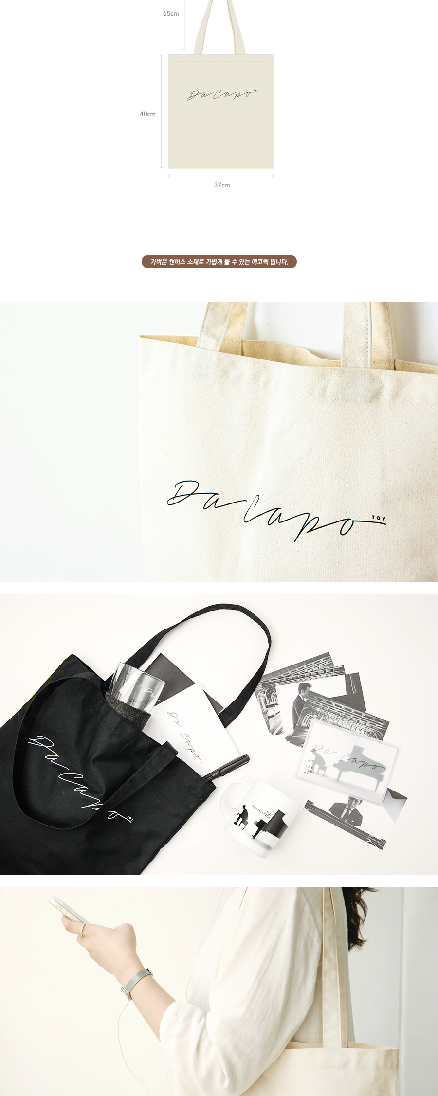 일반 에코백보다 얇은 원단으로 가볍고 내부에 PU코팅이 되어 사용하기 용이합니다.