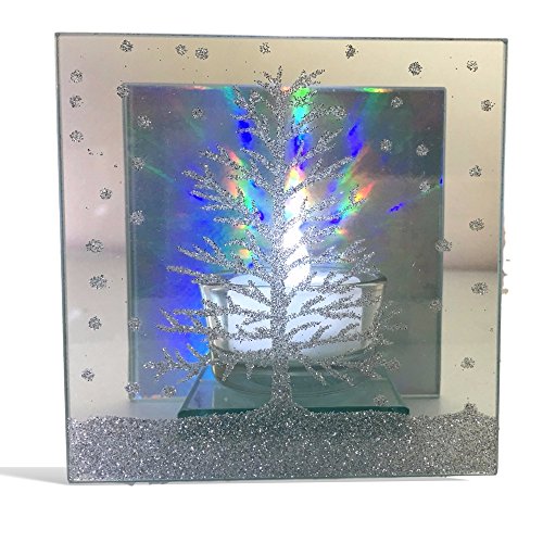Christmas Candle – Glass Candleholder with a Glittery Xmas Tree Design - Aurora Borealis Reflected in Background - LED Tealight included