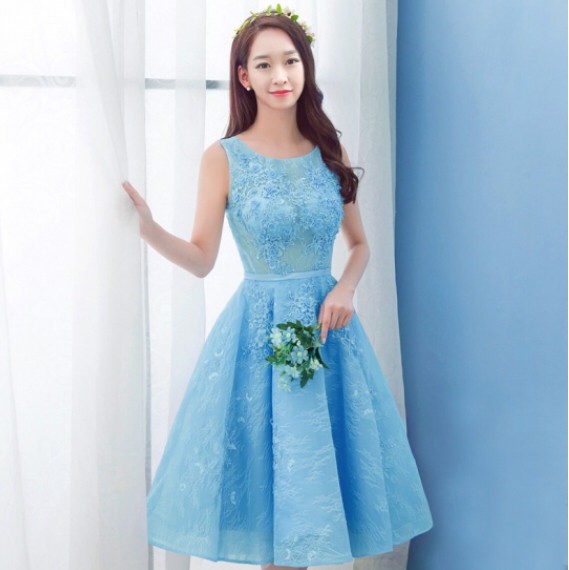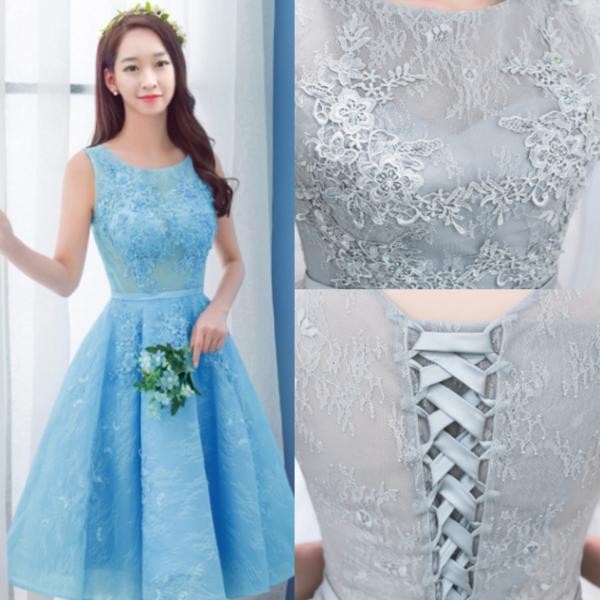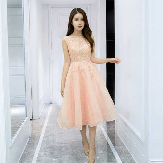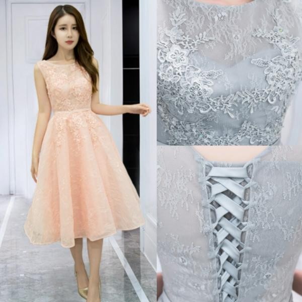 ハイウエストの切り替えレースアップ ノースリーブ パーティードレス ミモレ丈 ドレス ワンピース