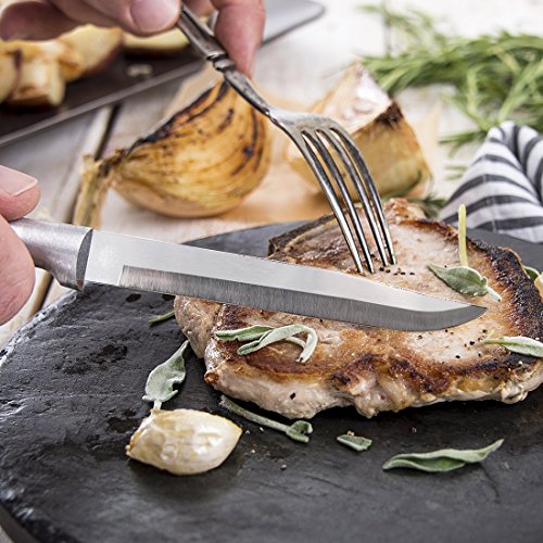 STAINLESS STEEL BLADES – The long blade on these steak knives allows you to use them at the dinner table or as a utility knife in the kitchen. The blades are made from surgical quality, T420 high carbon stainless steel and are razor sharp.