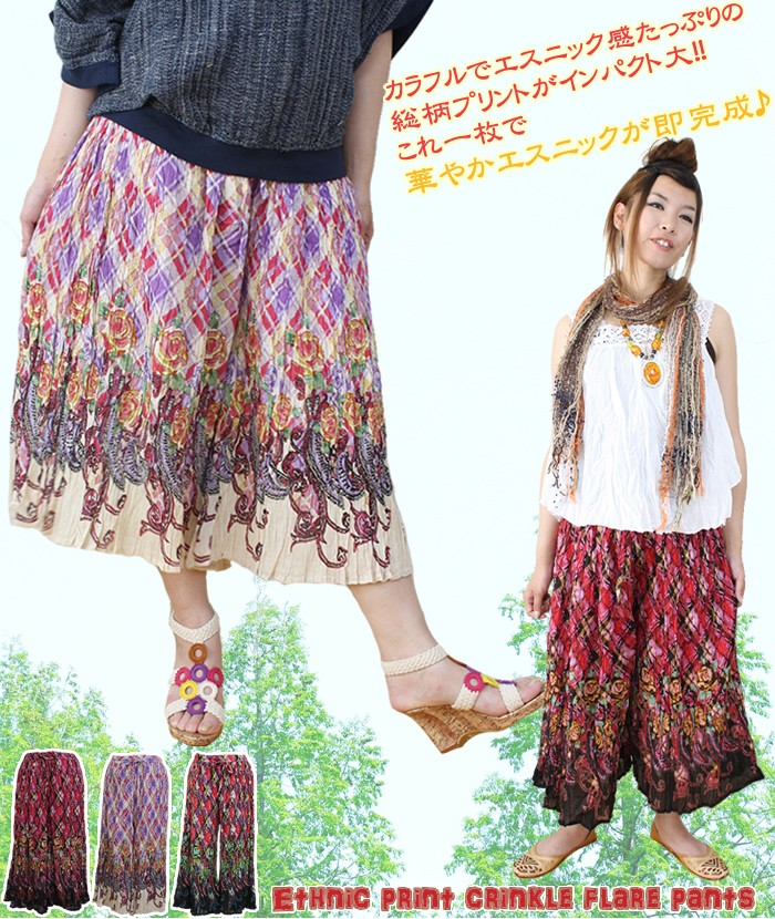 サンダルはコレ!!カラフルでエスニック感たっぷりの総柄がインパクト大!これ一枚で華やかエスニックが即感性♪落ち感のあるデザインでシルエットスッキリ★ウエストは総ゴム+ひも付きで調節も出来て楽ちん♪キャミソールやブラウスと合わせてフェミニンエスニック★ゆったりニットなどに合わせればちょっぴり大人エスニック♪色々着まわせてロングシーズン穿ける華やかパンツです!カラーは3色(A・B・C)※モデル身長 164cmSizeウエスト:約62cm~88cm(総ゴム)総丈:約76cm股下:約44cm○素材:コットン