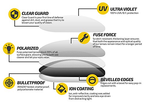 All of our lenses offer 100% UV protection, impact resistance that exceeds ANSI Z80.3 and EN 1836:2005 standards, multiple layers of the most intense and rugged hard coatings and hydrophobic coatings to keep your lenses clean and protected and, of course, a 100% money back satisfaction guarantee.