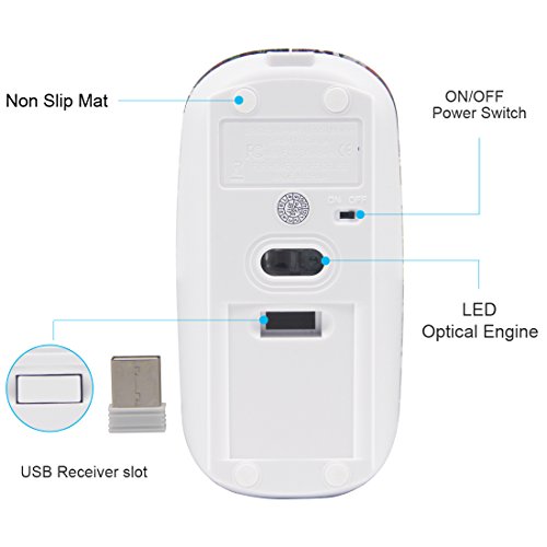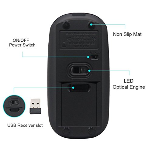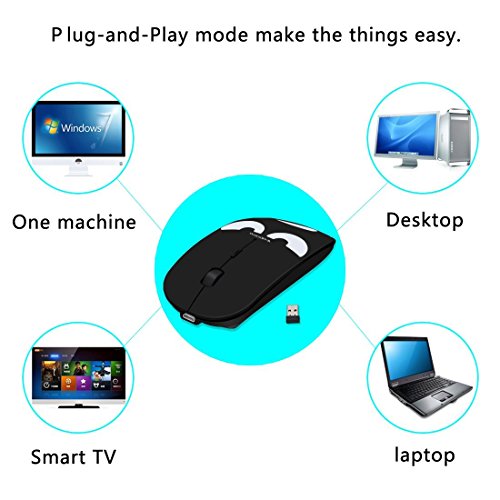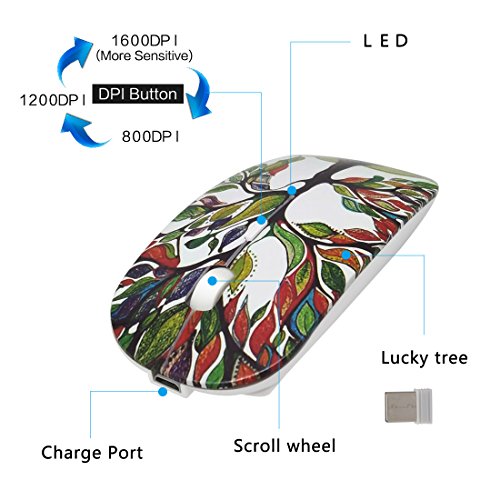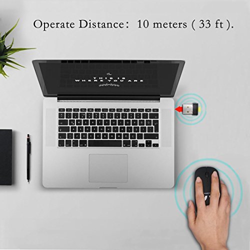 -. Feature : QUIET CLICK AND EASY INSTALLATION - Advanced sensor design of this laser mouse give you a quiet space and the 2.4G mouse comes with an usb receiver,simply "plug and play", no additional software of firmware is required. / RECHARGEABLE AND LOW POWER CONSUMPTION - This wireless mouse has a build-in rechargeable battery,easy to be charged by micro usb cable.The Auto Switch Off function helps you to save energy as your mini mouse will be in sleep mode in 15 minutes of inactivity. / SUPER COMFORT AND SLIM - Symmetric and ergonomic design makes this wireless mouse fit for both left and right hand.Naturally curved grip of the mouse keeps your hand confortable.Slim and portable design makes the mouse can be used anywhere,a great travel mouse . / 3-LEVEL ADJUSTABLE DPI - Easy to switch DPI level (800DPI,1200DPI,1600DPI) to adjust speed and can move smooth on most surfaces without mouse pad .This bluetooth mouse can meet your demand of daily office working and personal preference. / WIDE COMPATIBILITY - Compatible with Win7 , Win8 , Win10 , Linux OS , Mac OS and Android OS. Fit for Notebook, PC, Laptop, Computer, Macbook and other device with USB interface.