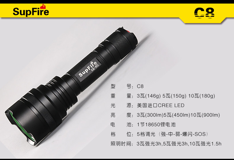 Lighting mode: five dimming lighting (high / medium / low / flash /SOS)