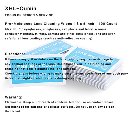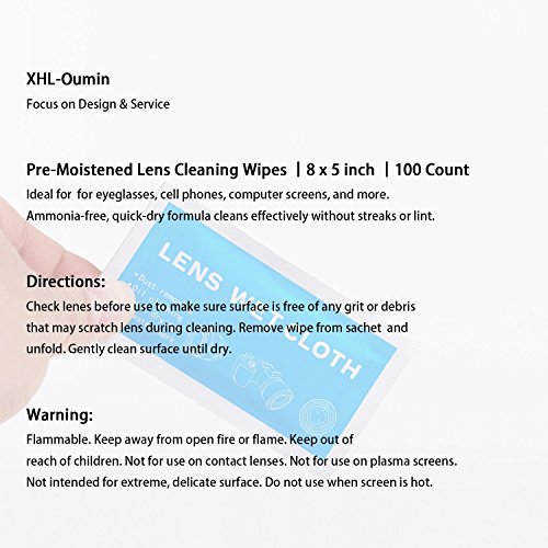 Studio : XHL-Oumin Publisher : XHL-Oumin Binding : Electronics Product Description These Pre-Moistened Lens Cleaning Wipes are a simple, effective, safe way to clean plastic, polycarbonate, and glass lenses and surfaces. Quick Drying, Streak-Free, Ammonia-Free, Lint-Free, Anti-Static, Anti-Fog, Scratch-Free They're perfect for eyeglasses, sunglasses, cell phone and tablet screens, computer monitors, mirrors, camera and other optic lenses, and are even safe for all lens coatings (such as anti-reflective coating).
