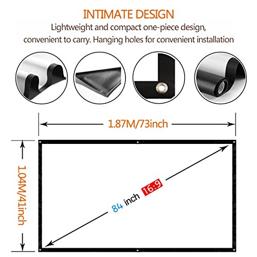 Specification: Diagonal : 84inch Screen Format:16:9 Material : White matte and pvc Screen size : 73x41 inches Weight of shipment : 1.1 kgs Packing size : 114x6x6cm