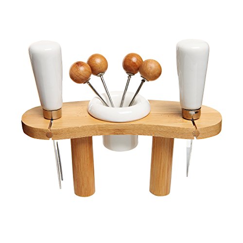 Presentation is key when you want to impress your guests. With this deluxe set, this is the perfect cheese board and hors d'oeuvre server for your next party or gathering. A classic white ceramic platter with 4 welled compartments to serve a variety of sides that will complement your favorite cheeses, charcuterie, and snacks. Each set is complete with a center cheese board, ceramic serving platter, cheese fork, cheese knife and 4 cheese picks with a small cup and a removable standing rack. This is the ideal set for you to serve delicious cheese paired with your favorite snacks and wine at your next get-together. Also, can be used to serve other food items at a formal or casual event.**Official MyGift® product, includes multipurpose towel.**