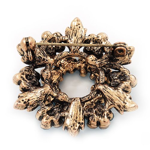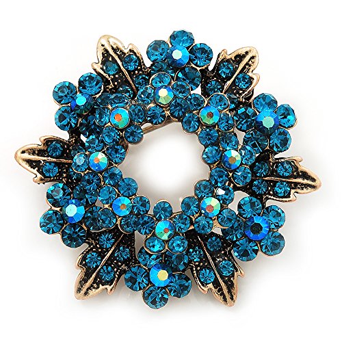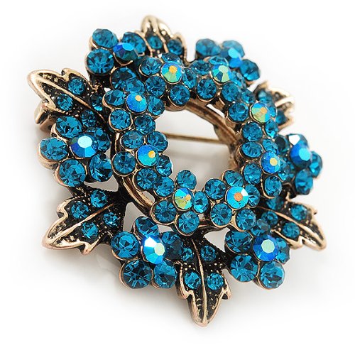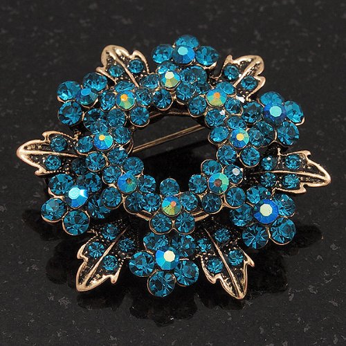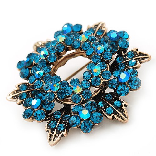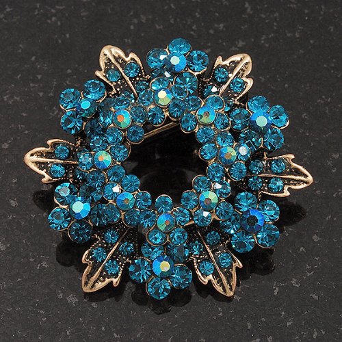 Command admiring glances wherever you go with this Turquoise Coloured Crystal Wreath Brooch In Antique Gold Metal. This ornate wreath features daisies in turquoise coloured rhinestones on an antique gold metal. Measures approximately 40mm in diameter. Attaches securely with a pin clasp. Attach it to the lapel of a blazer for the workweek or a cardigan on the weekends.Feature