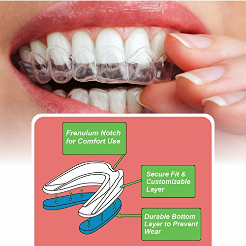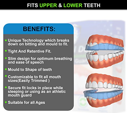 MOULDABLE FIT TO PREVENT BRUXISM & CLENCHING: The ultra-comfort guard relaxes jaw muscles, prevents teeth grinding, clenching and alleviates problems that may cause dental injuries Therefore, it prevents Bruxism and its related symptoms such as facial muscle pain, spasms, neck and joint pain, insomnia, shoulder pain and headache. The nightguard also prevents Temporomandibular Joint Disorder (TMJ).
