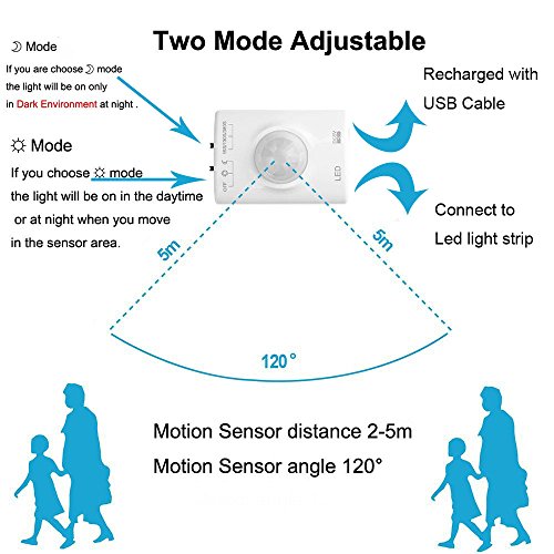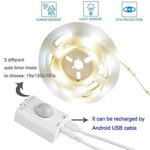 - Motion activated & Rechargeable - Motion detector can be recharged by Android USB Cable (included) ,The LED strip lights automatically turn on when detecting human motions, 3 different auto timer mode to choose: 15s/130s/380s.