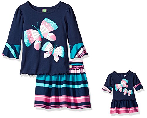 3/4 sleeve knit top with printed ruffle cuffs and butterfly applique. Striped knit skirt. Comes with matching doll garment.
