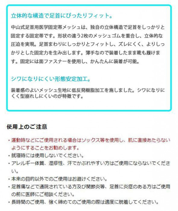 fk094igrjs立体圧迫構造で足首をしっかりサポートします通気性の良いメッシュ素材です サイズ 個装サイズ:18×11×4cm 重量 個装重量:90g 素材・材質 ポリエステル、ナイロン、ポリウレタン、合成ゴム 仕様 左右兼用 洗濯方法:手洗い、陰干し 【適応サイズ】 足のサイズ:22~27cm 足首周囲:約30cmまで 製造国 日本 立体的な圧迫でフィット感抜群 ※予告なく製品の仕様が変更になることがあります予めご了承ください ※1枚売りです(左右に着用される場合には2枚ご購入ください) 立体圧迫構造で足首をしっかりサポートします通気性の良いメッシュ素材です