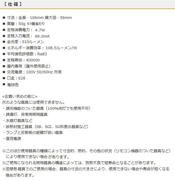 白熱電球40形相当の明るさ。密閉形器具にも対応します。光色は電球色で12個入りです。屋内でのみご使用いただけます。