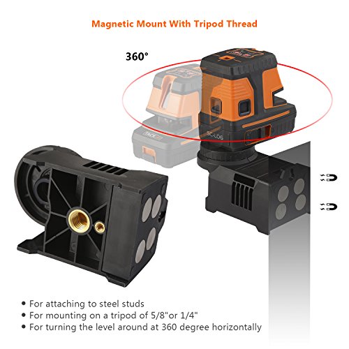 - ▲ENHANCED MAGNETIC BASE WITH TRIPOD THREAD - Base with ultra strong magnetic that can be attached to any steel surfaces or studs, rotate 360 ° horizontally; Both the laser level and base are equipped with standard threaded holes (1/4”and 5/8”) to work with tripods