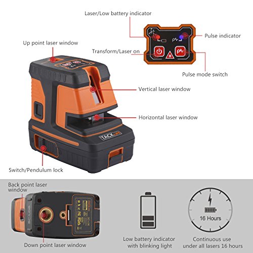 - ▲SEPARATE “PULSE” BUTTON AND DURABILITY - The blue LED lights when entering pulse mode, the laser beam would become slightly dim than default mode, compatible with the laser receiver can be more stable; With all lasers on, the battery can last around 16 hours; Protected against dust and splash water with IP 54; Covered by TPR soft rubber for shock resistant