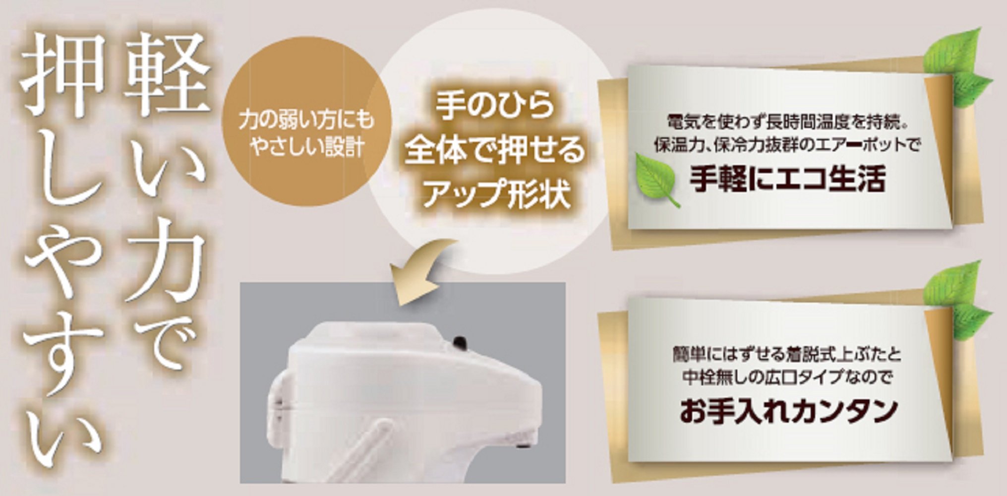 This pot is tall. Because the diameter is small around, I will not take up space. I'm happy to hear that tables are small, so I'm happy if it's a bit small. The thermal insulation is preeminent. It is 10 hours at 73 ° C. The hot water in the morning is hot until evening. Moreover, 2.5 L is included. It is nice to have fun in winter when you can enjoy hot tea without boiling water many times. It is easy to use because the pushing part is also wide and no force is required