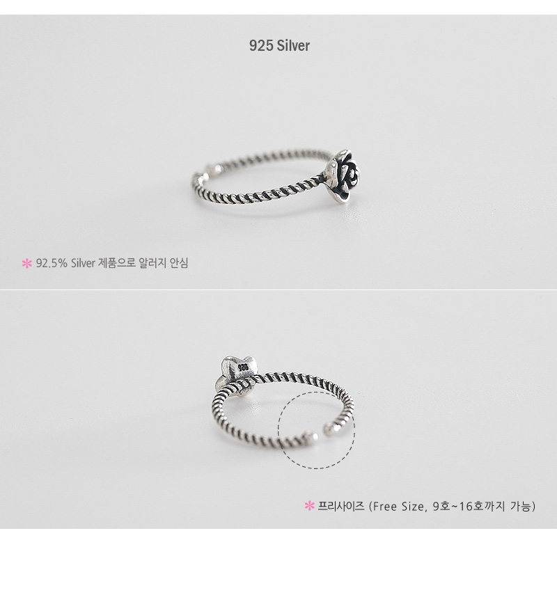 92.5 실버 소재로 고급스럽고 엔틱한 매력이 있는 제품. 프리사이즈로 사이즈 조절이 가능해 실용적인 제품.