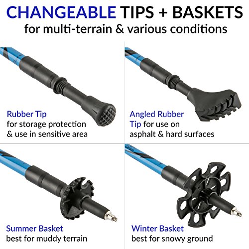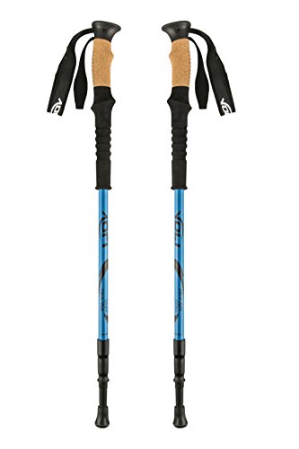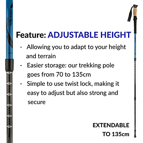 Our trekking poles are built to be durable, light, and anti shock. They come with a telescopic design that allows the poles to be collapsible/adjustable so you adjust your poles to the perfect height and use them comfortably, no matter what terrain or conditions you're facing.