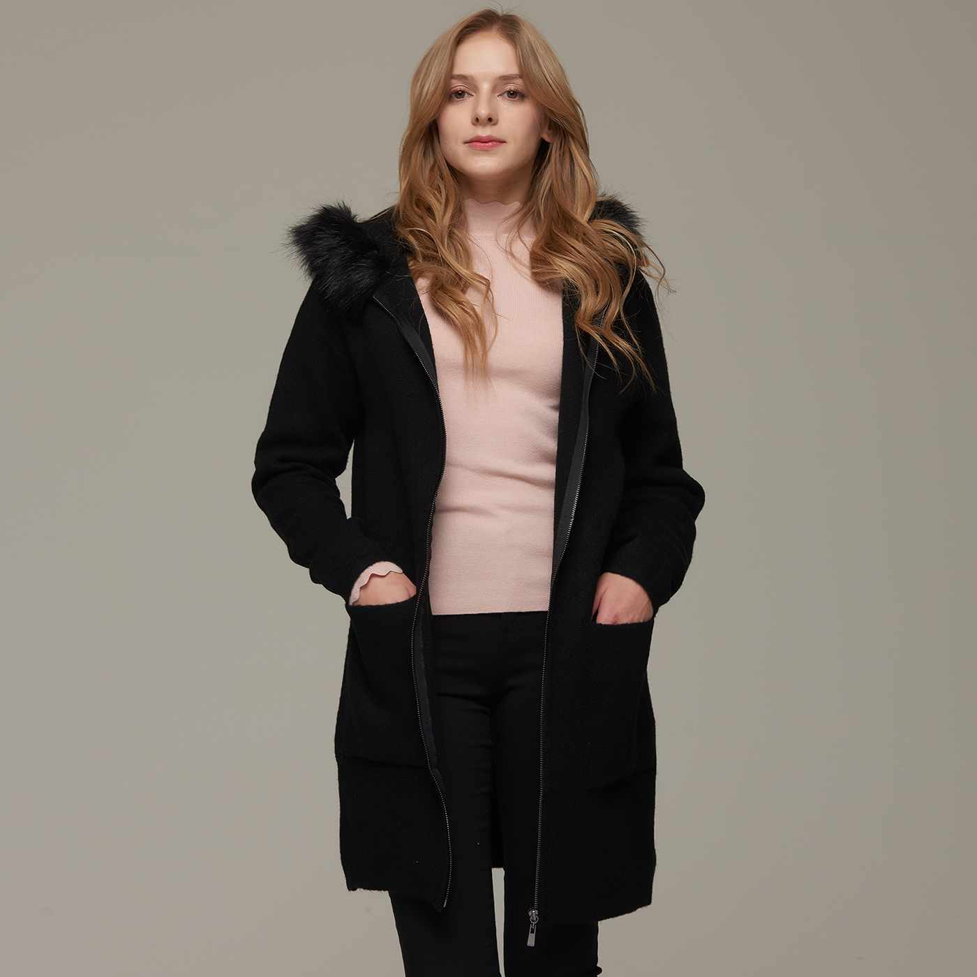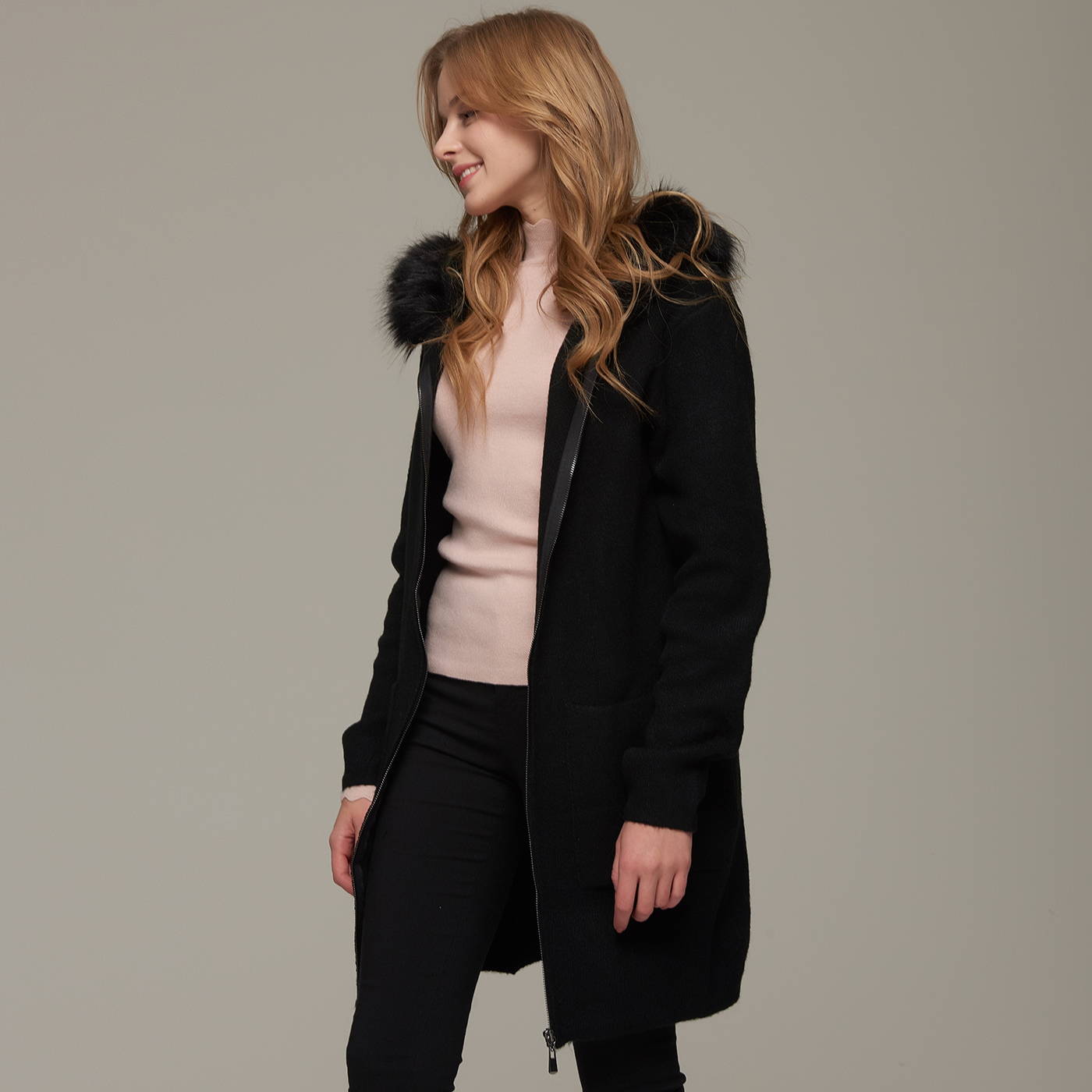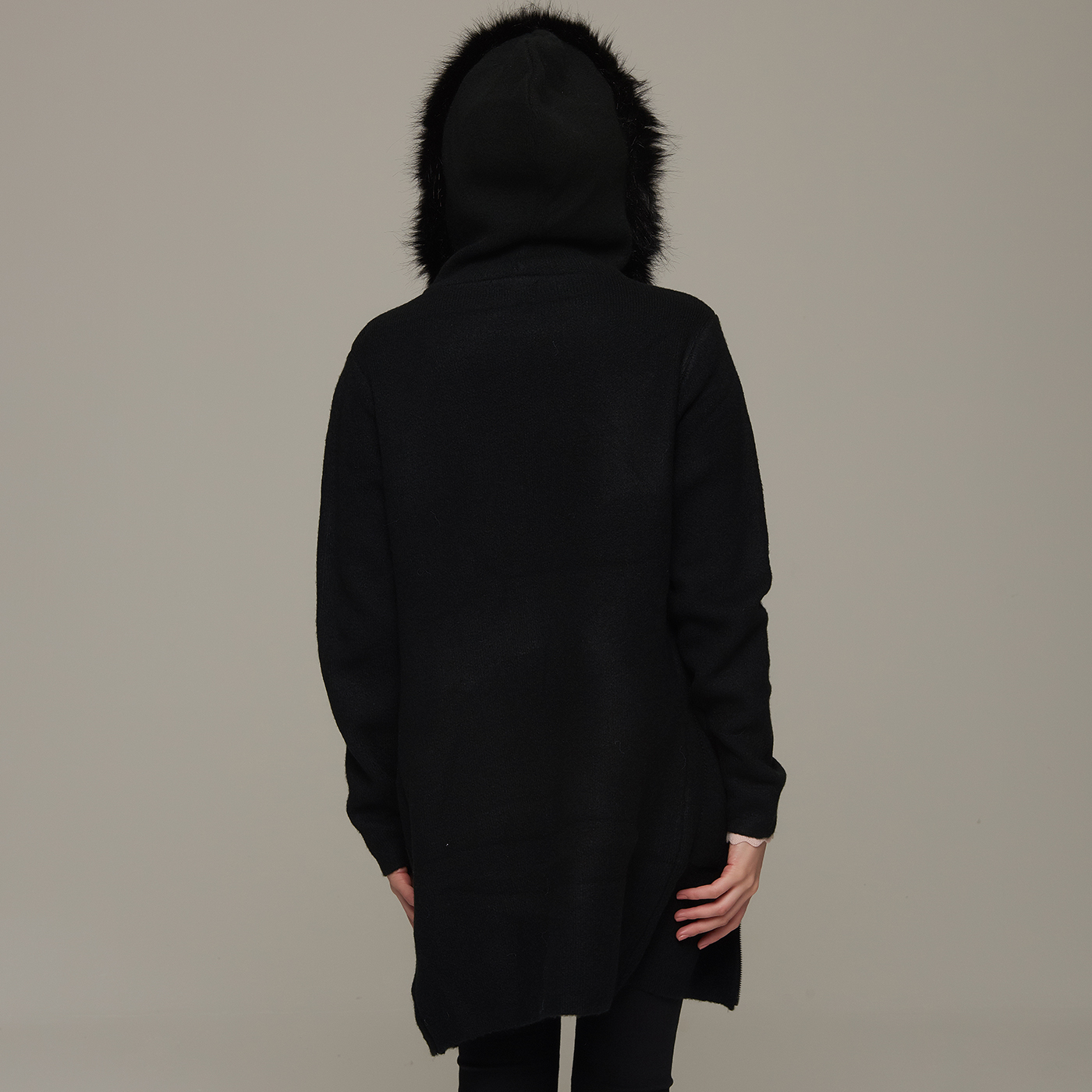 퍼후드가 달린 긴기장의 짚업 니트 가디건으로 코트나 점퍼안에 레이어드해도