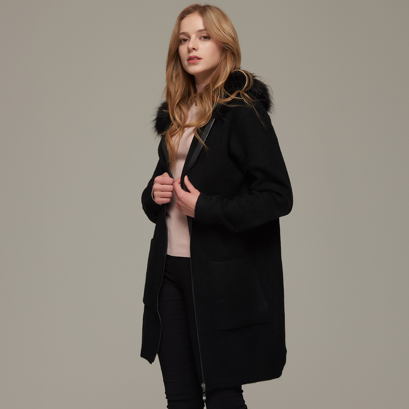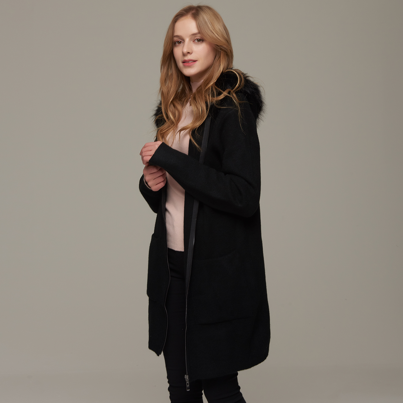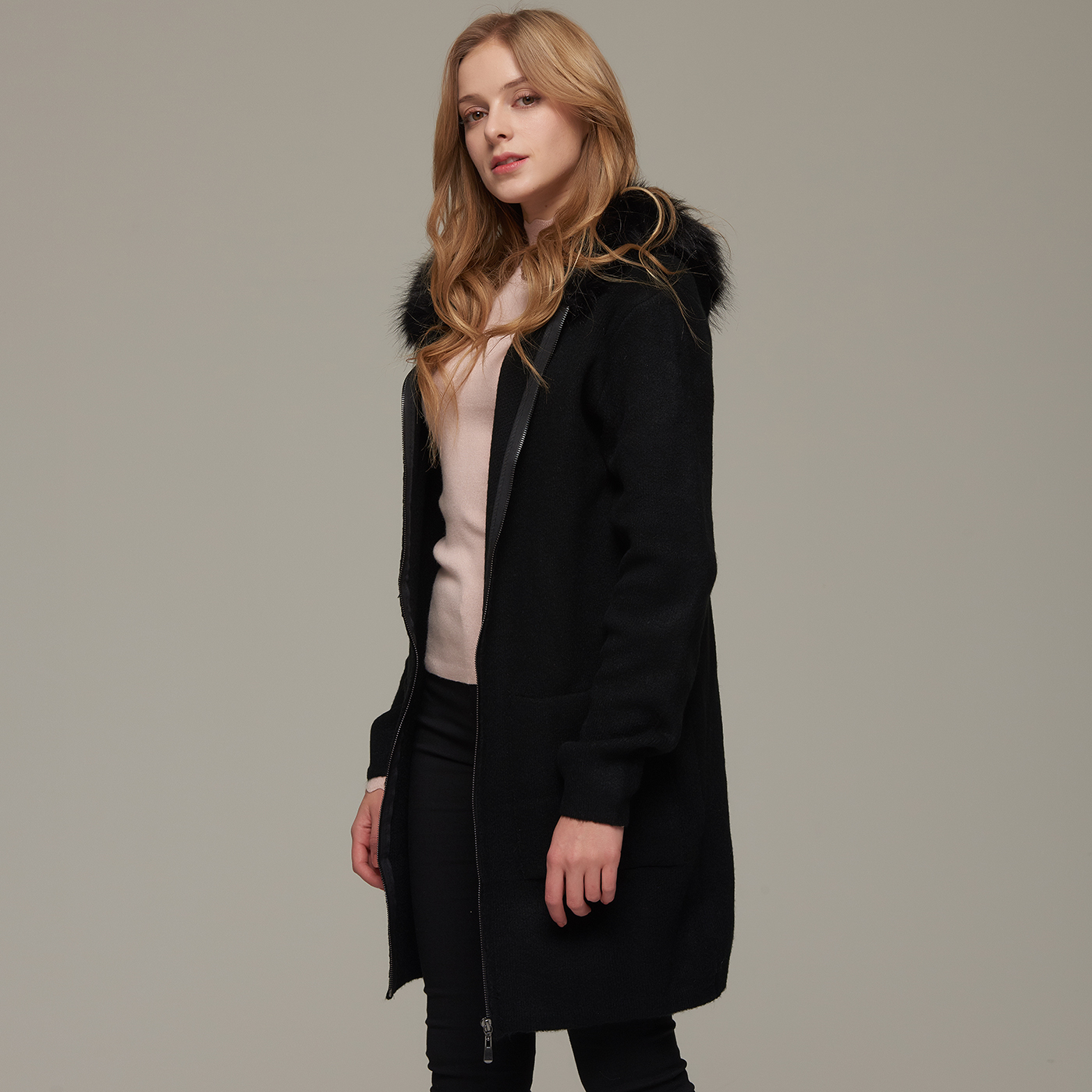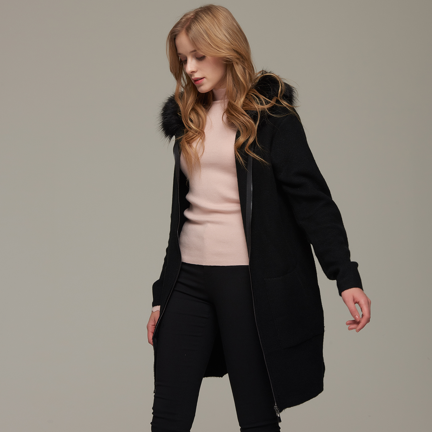 퍼후드가 달린 긴기장의 짚업 니트 가디건으로 코트나 점퍼안에 레이어드해도